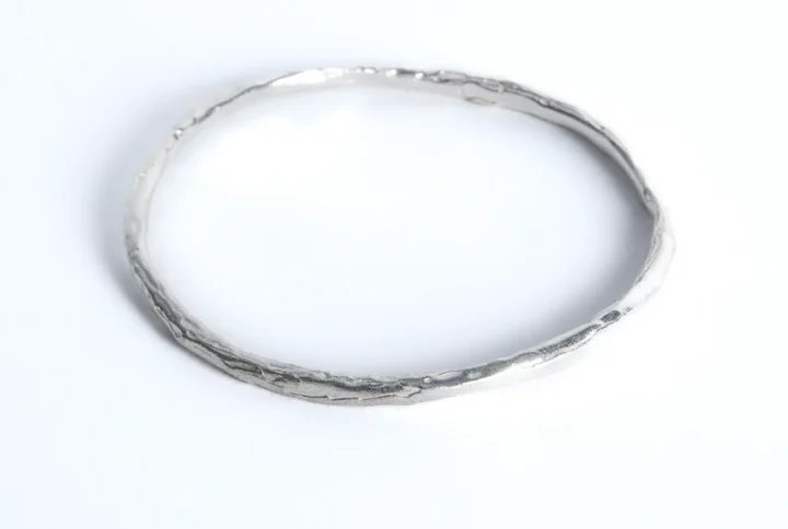 Bracelet rigide au design minimaliste et à la texture organique, inspiré par la beauté de la matière brute.